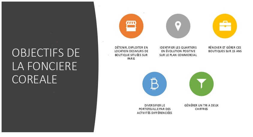 - Un contexte de marché favorable. Le marché parisien des commerces est très dynamique. Le positionnement de la Foncière COREALE sur ce marché immobilier, le plus profond et le plus liquide de l’Hexagone, permet d’adopter une stratégie d’investissement claire et génératrice de profitabilité. La Société de gestion réalise des acquisitions dans des immeubles simples à gérer et en conformité avec les exigences des locataires.